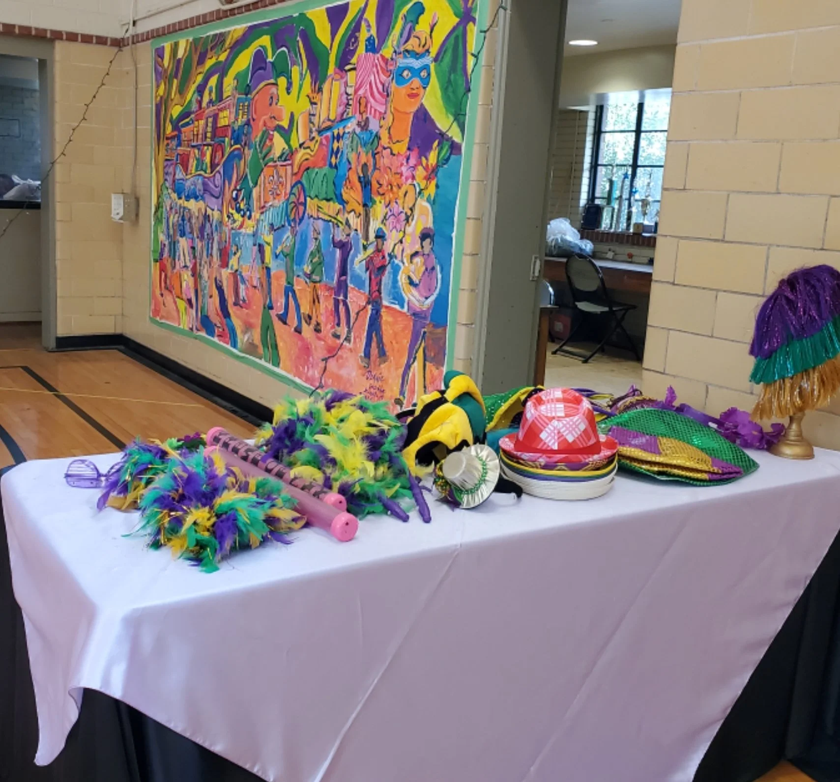 Please join us for a magical evening in the park as the gym is converted into a New Orleans-inspired party venue, complete with lights and disco ball! A special prize for the best Mardi Gras costume. Plenty of outside seating on the back covered patio as well.