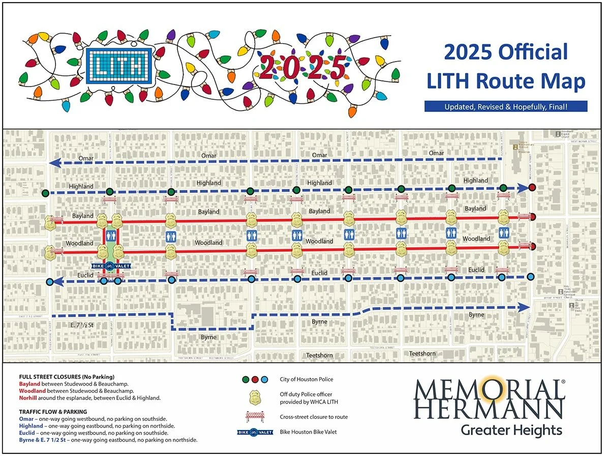 The WHCA and our generous LITH volunteers have been working tirelessly to ensure that the 2025 Lights in the Heights is truly memorable! The Lights in the Heights committee, with your valuable input, has selected Bayland and Woodland as the official route for the event, with the “anchor” at the Norhill Esplanade. We can’t wait to see the neighborhood come alive with your creative displays!