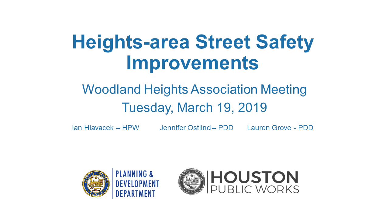 The WHCA General Meeting on March 19th included a presentation about plans to change the configuration of 11th Street, Studewood and Pecore. This presentation helped to inspire an impressive turnout (62!) for the meeting, which was held in the library at Travis Elementary School. Since there are no doubt many others who would be interested in the details of this project, we recorded the meeting, to make it available here. The slides used in the presentation are also available in PDF format.