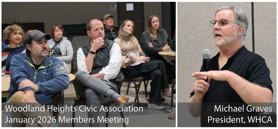 Here we are at the end of January already. Lights in the Heights is now well behind us. Immediately following our neighborhood event, the holiday season hit like an avalanche. There was barely time to recuperate before the first WHCA board meeting of the year.