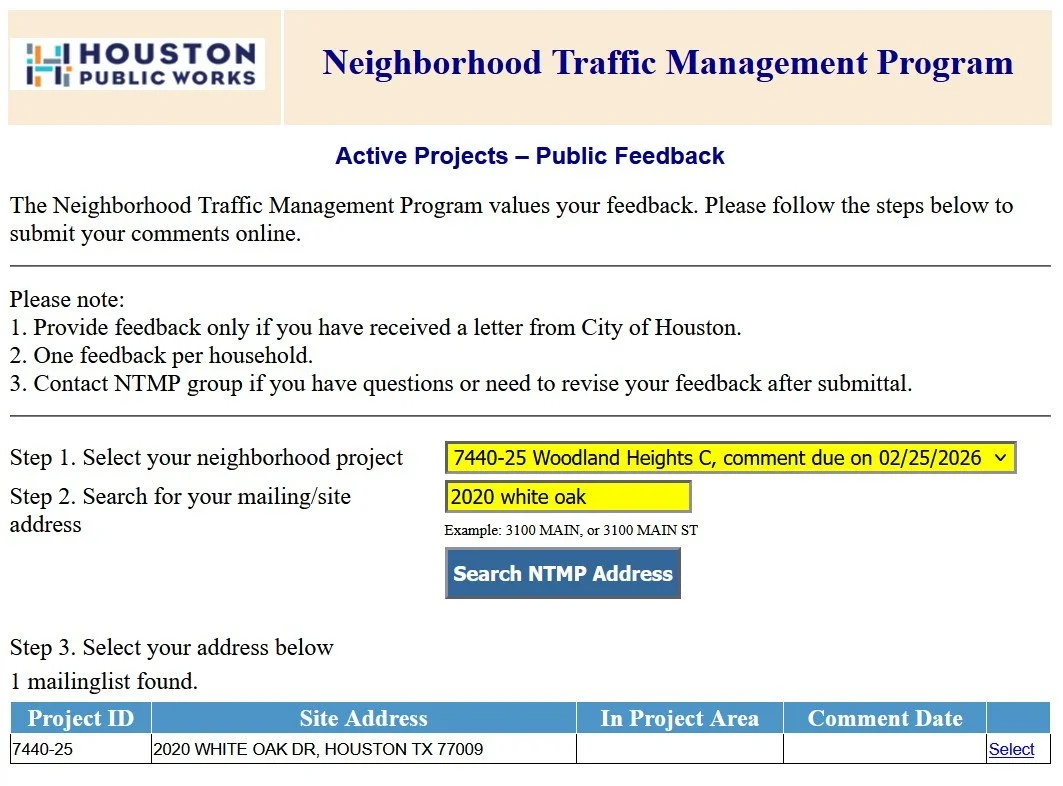 City of Houston Public Works is obligated to seek public comment on the plan. They are specifically required to seek comments from neighbors who live within 0.5 miles from the project location. Neighbors within that radius will receive a mailing with a comment form.