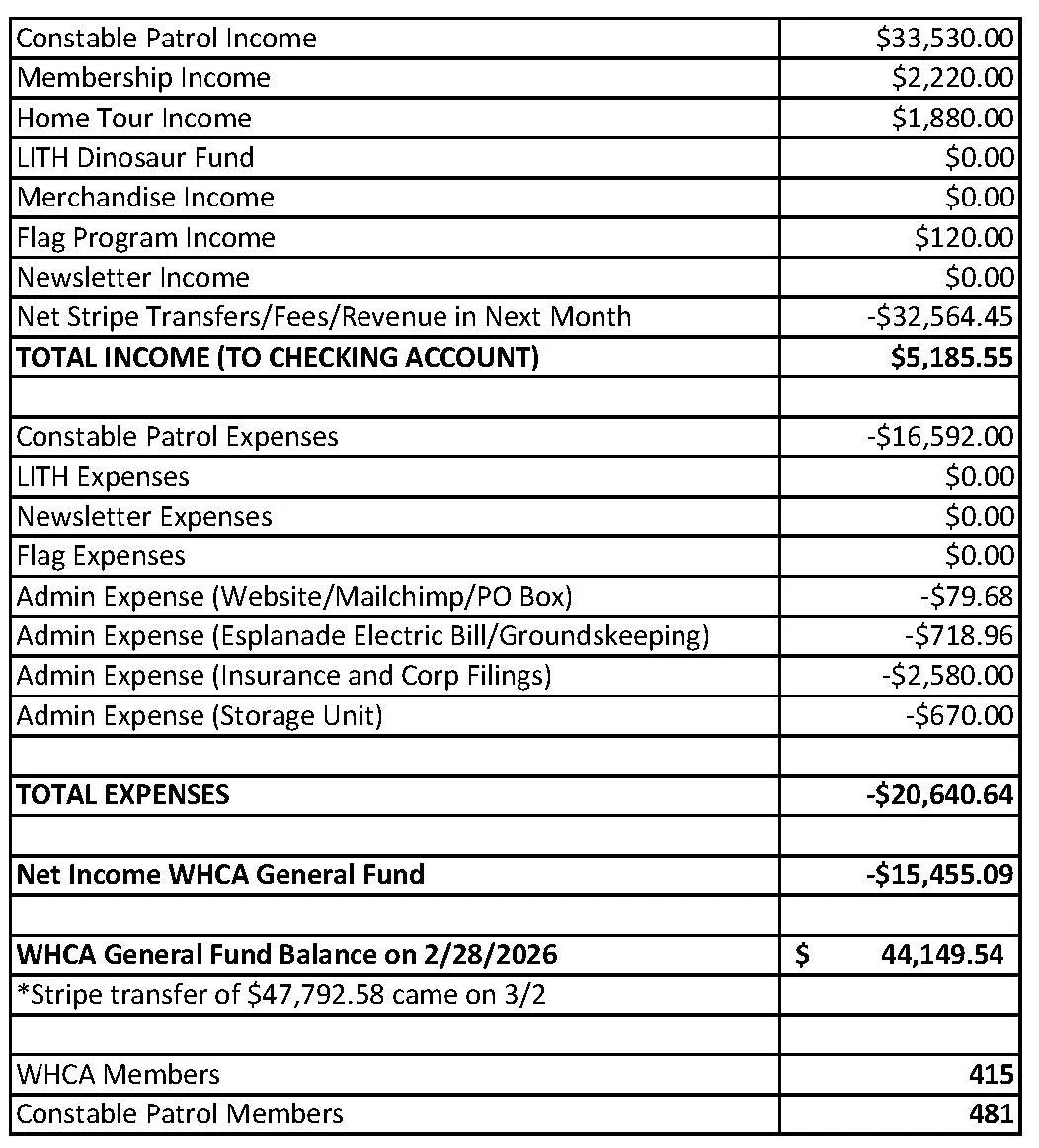 WHCA February 2026 Financial Statement /April 3, 2026 by Doug Carroll Questions about WHCA finances can be directed to Doug Carroll, Treasurer, at treasurer@woodland-heights.org.