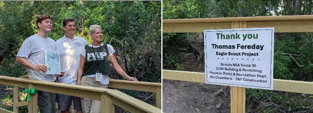 Life Scout Thomas Fereday chose the Double Plank Bridge installation as his Woodland Heights Eagle Scout Project. The project replaced an unsafe plank crossing that was in extreme need of replacement. Now completed neighbors who walk the nature trail running through the Woodland Heights Nature Preserve will not only have an easier way to cross the gully across Little White Oak - but they will be much safer while doing so.
