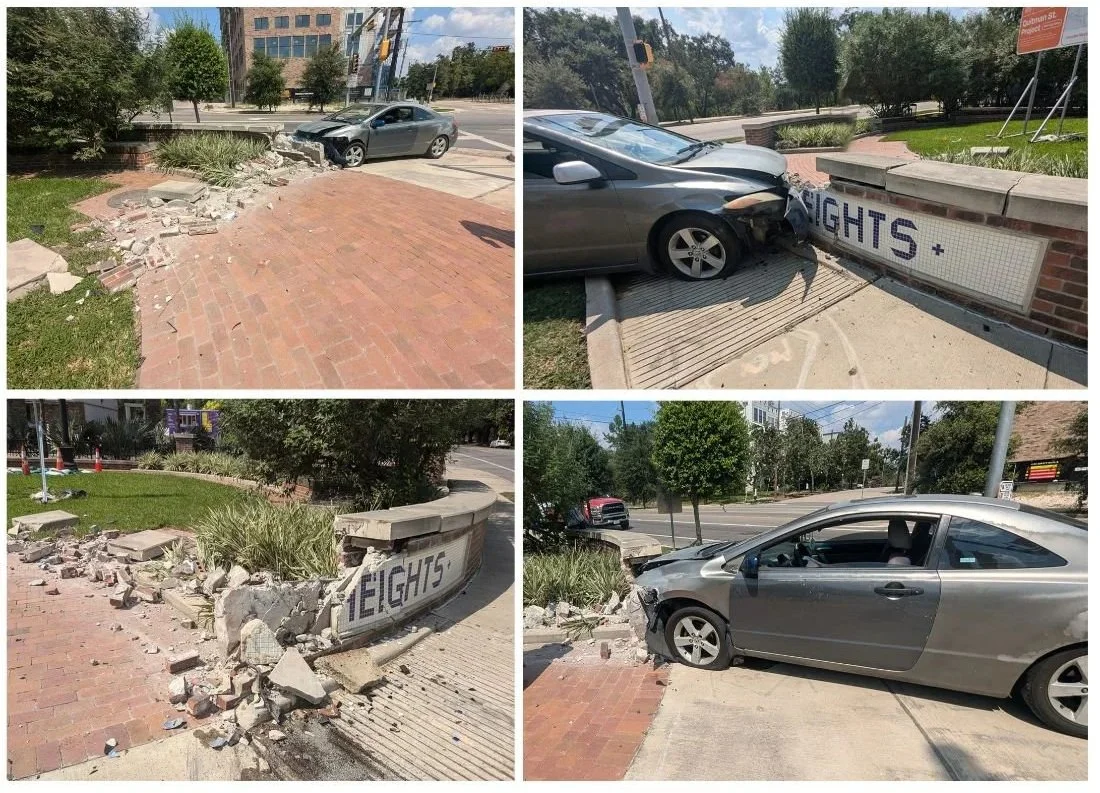 If you recall, the sign was damaged back on August 10, 2024 following an accident that propelled a vehicle into half the sign. Since then we've been waiting and asking for updates as the Memorial Heights Redevelopment Authority TIRZ 5 worked through the paperwork to hire a contractor to make the repairs. Our last update from TIRZ5 stated they were in the process of finding a contractor we had not heard an update that one had been selected and approved.