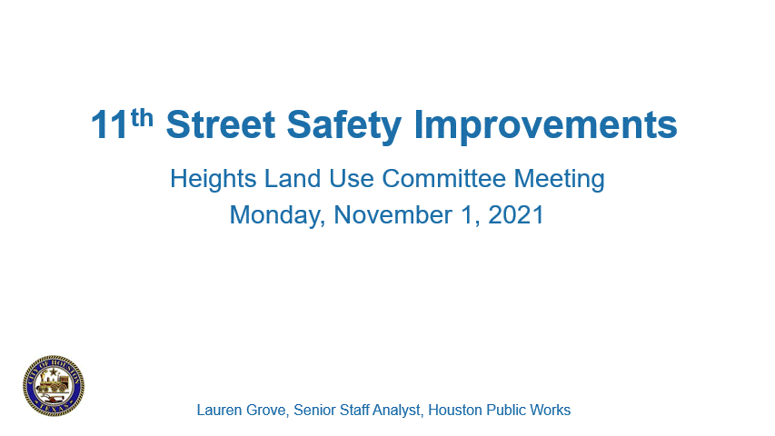 The City of Houston will make another presentation at the Greater Heights Super Neighborhood meeting next Tuesday, Nov. 16th at 6:30pm regarding the 11th Street Project. Email Brad Snead for the Zoom info at infrastructure@woodland-heights.org.